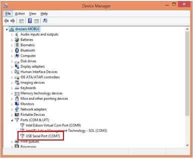 a. una vez conectado el cable USB, la placa Intel® Edison aparecerá en el administrador de dispositivos en puertos (COM & LPT) como un USB Serial Port. Recuerde que el número de COM para los próximos pasos.