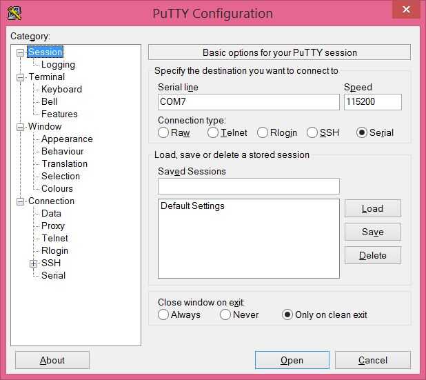 c. abrir masilla, seleccione tipo de conexión serie y luego ingrese el valor de línea serie como el puerto COM en el COM7 anteriormente, en este caso. Para el tipo de la velocidad de 115200. Haga clic en abrir.