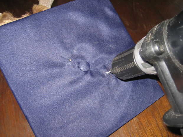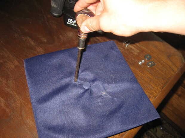 Por último, deberás taladrar los agujeros en la placa de cráneo y de la Junta de mortero. Perforar el cráneo en primer lugar, será más fácil marcar a través de los orificios en el cráneo a la tapa que viceversa. Una vez que tenga los agujeros marcados en la tapa, taladro en la tapa, teniendo aquí un juego de manos que ayudan a mantener al tejido apretado. Un punzón también podría ser útil aquí ampliar el agujero un poco más.