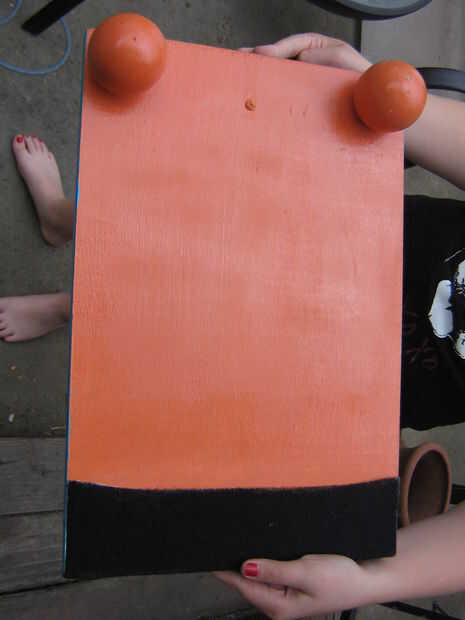 Tomé un pedazo de madera contrachapada y cortarlo a un tamaño que estaba cómodo con junto a dos grandes redondas bolas de madera (cada uno con un lado plano) en mi tienda local de Michaels. Pinté la Junta y bolas de madera a dos colores diferentes, que elegí.