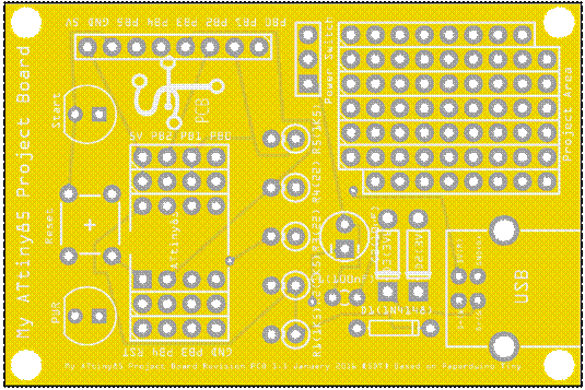 Quería que la PCB personalizada para breakout todos el chip pernos encabezados de macho y hembra, también quería las clavijas que en orden de izquierda a derecha; PB0, PB1, PB2, PB3, PB4, PB5, GND y VCC. Yo Fritzing para extraer el esquema utilizando el Paperduino Tiny como la plantilla, pero manteniendo las dimensiones del tablero de 60 mm x 40 mm. cuando era feliz con el diseño, exporta el proyecto como Gerber archivos a una carpeta. Esto entonces con cremallera y con GerbLook, confirmando que los archivos eran legibles luego procedí a solicitar mi PCB personalizado de PCBWay (10 PCB $13 + S/H $28). Las tablas estaban en mis manos cuatro días más tarde.