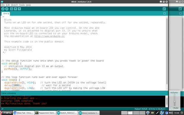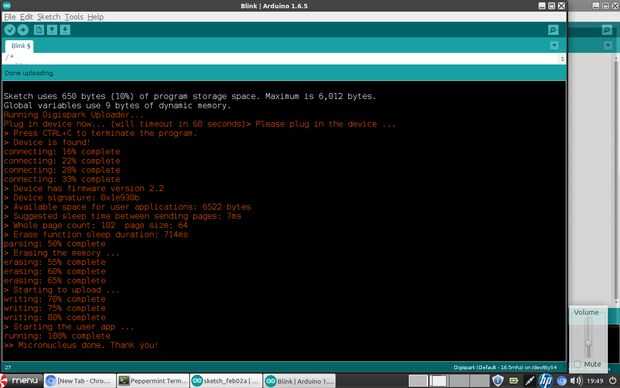Compilar y flash el bosquejo de parpadeo a la Junta, no te olvides de cambiar el número pin de 13 a 1. Cuando el sistema le solicita, Presione RESET. El LED de inicio debe comenzar a parpadear.