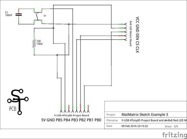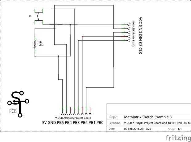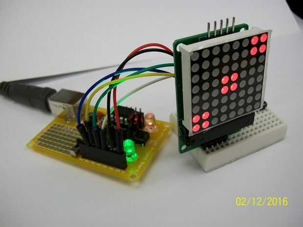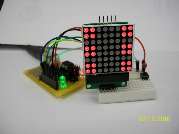 8, 8, 0, 0, 0, 24, 24, 0, 0, 0 byte DIE_1[] = {8, 8, 0, 0, 0, 24, 24, 0, 0, 0}; ... m.writeSprite(0, 0, DIE_1); Intente cambiar el tamaño de esta matriz, digamos 10 debe ser un buen compromiso. Compilar el bosquejo y cargarlo en el dispositivo ATtiny85, intente presionar el botón otra vez.