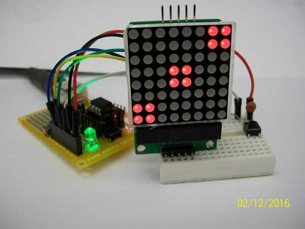 Usando el bosquejo MatMatrixExample2.ino descargado en el paso 6, intente presionar el botón que acaba de agregar al circuito.