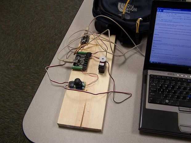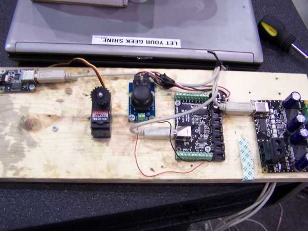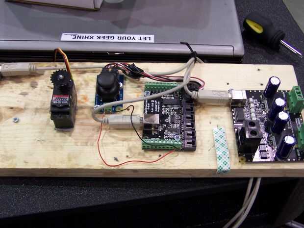 Para conectar los controladores de phidgets, utilice los manuales de producto. El programa que escribí es una aplicación de consola basada y está diseñado para funcionar con los controladores de phidgets. En orden para que funcione correctamente, el motor del componente Y debe atornillarse en la ranura 0 motor. Conectar la batería por conectar los cables de altavoz desde el positivo de la batería al positivo en el regulador del motor de HC. Hacer lo mismo con el negativo.