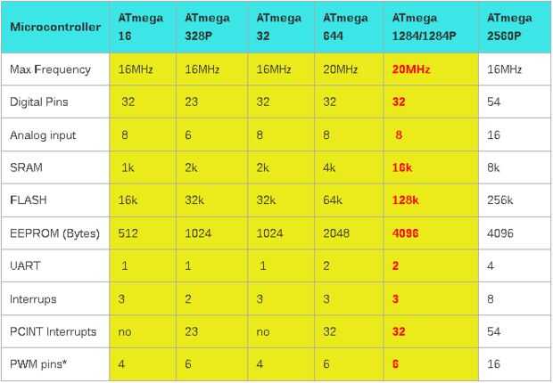 Aquí está una comparación entre varios microcontroladores comunes (DIP40 paquete) de familia ATmega.