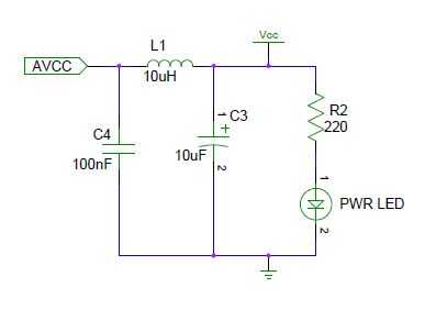 AVCC se filtra con L1(10uH) y C4(100nF) para mejor inmunidad de ruido de la sección de ADC. Este filtro puede omitirse si usted cuenta que no se utilizará ADC (o precisión de entrada analógica no importa demasiado).