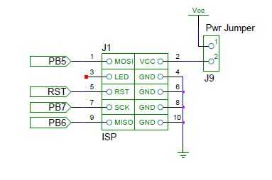 Potencia puente J9 permite desconectar el circuito Vcc programador en circuito de alimentación de una fuente externa (usando J6 - Vcc y J7 - Gnd)