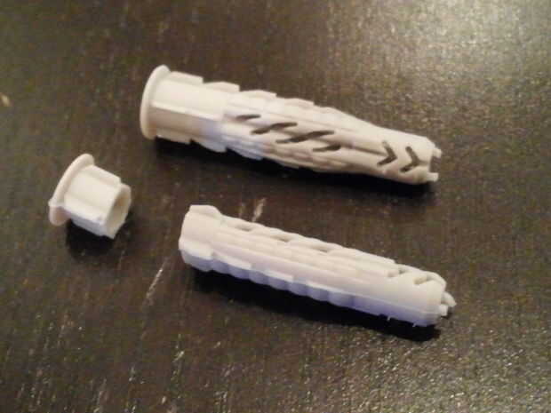 Cortar el "sombrero" de un enchufe de pared de 5mm y recortar sus "aletas" / "alas". Esto facilitará su camino en los brazos.