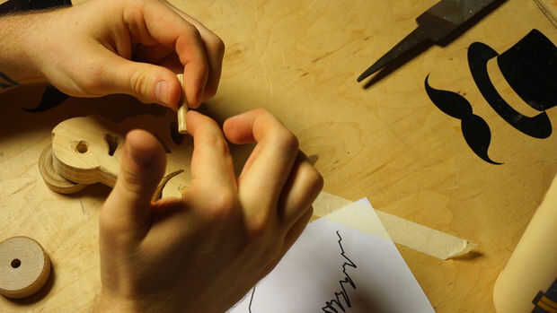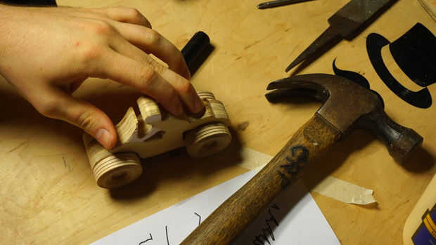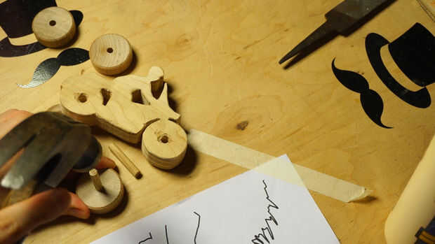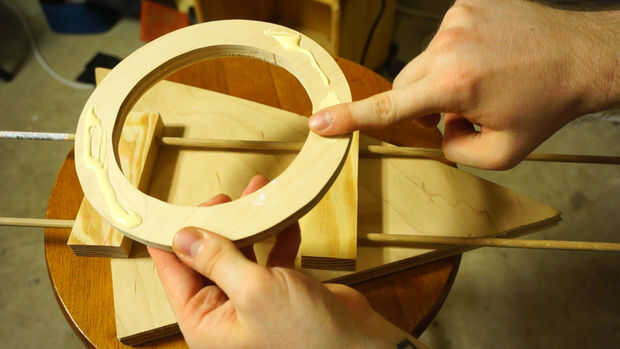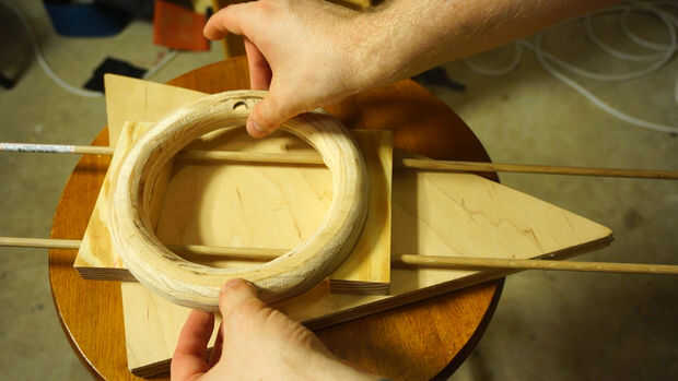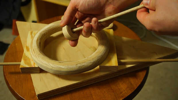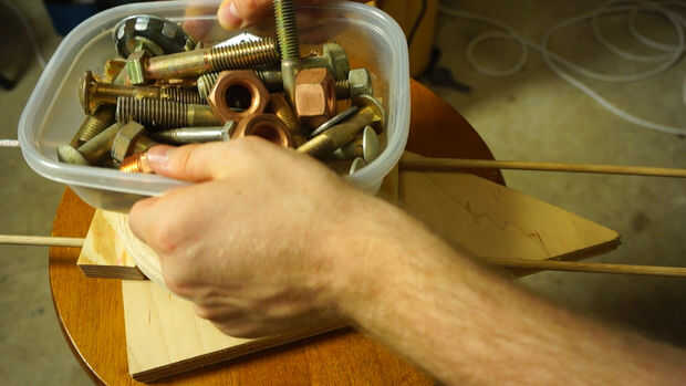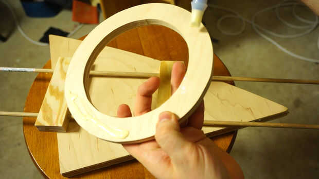 Inserte las varillas en los bloques de madera para evitar que en su mayor parte paralelo. Nosotros no estamos construyendo cohetes aquí, además de que es un juguete de los niños para que no te preocupes si las cosas no están exactamente alineadas. No lo hice! Marcar el medio Toro después de burlarse de las piezas de madera para saber dónde pegar. Aplique una cantidad fina de pegamento en el dorso del Toro y coloque en los ladrillos con los tacos. Empuje hacia abajo y deje que la madera es de squish alrededor hasta que se instala, luego lugar de peso en la parte superior. Deje que se seque.