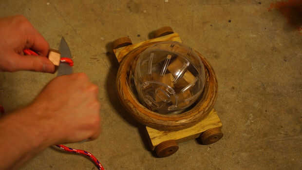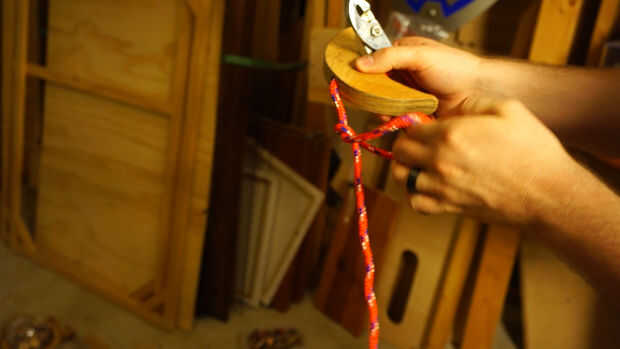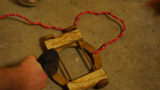 Elegí esta cuerda roja hermosa porque ya la tenía en mi tienda. Diseño de sus vehículos y a globo ocular las longitudes. Es un juguete, así que no se es derecho o incorrecto. He utilizado una grapadora para grapa la cuerda por lo menos dos veces en la parte inferior de los dos vehículos más grandes. Para la motocicleta, he modificado un gancho de cuadro plateado de latón para darme algo para atar la cuerda. Asegúrese de usar un encendedor para derretir entonces extremos de la cuerda para evitar que se deshilache. Tenía un pedazo de forma de media luna de madera que me recordó un poco de una garra de raptor. He perforado un agujero anterior y había anuda la soga.