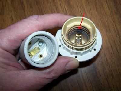 La toma de la izquierda es un socket de porcelana que encontramos en Home Depot. Aviso de la cabeza del tornillo de metal blanco en la parte inferior de la base de porcelana. Esto será importante en el paso siguiente.