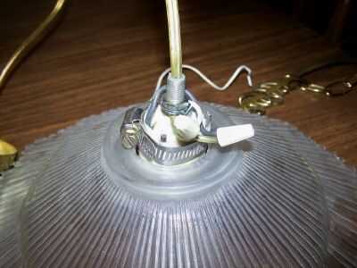 Deslice la manguera de la abrazadera hacia abajo sobre las varillas pegadas a la toma de porcelana y apriete el tornillo de la abrazadera tanto como usted puede.  Recorte los cables y hacer sus conexiones con tuercas para alambre.  Si la pantalla de cristal no cuelgue nivel, puede utilizar alicates de punta para agarrar los extremos doblados de las barras de acero para torcer y empujar o tirar de ellos hasta que la sombra es cuando se cuelga de la lámpara.