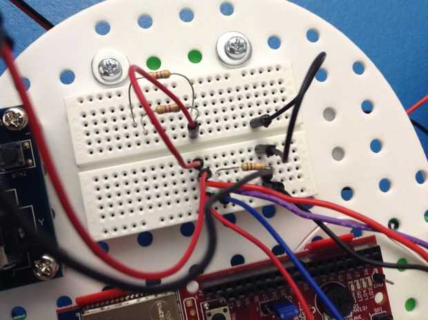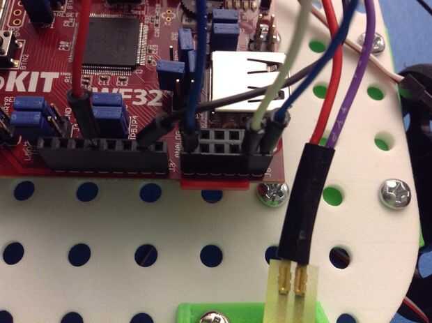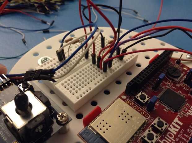 A continuación, conecte el PmodACL al chipKIT WF32 usando I2C. La primera es la línea SDA y la segunda es la línea SCL. Ambas de estas líneas necesitan resistencias de pull-up de 4,7 k. Conectar Vcc a 3,3 v y tierra a tierra en el protoboard. Utilice las resistencias k 4,7 para conectar cada línea a 3,3 v individualmente. Conecte las líneas SDA y SCL a la protoboard como se muestra arriba.