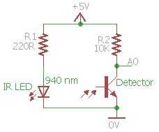 JustAPendulum utiliza tres sensores con una configuración mínima para detectar objetos a través de los rayos directamente. El circuito es muy pequeño y fácil de hacer. Devuelve un valor analógico que puede ser leído en los pines A0, A1 y A2. ¿Por qué tres sensor? Usé tres sensores para rastrear la bola en la pantalla del programa compañero.