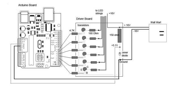 Conecta (+) plomo del transformador desconectado (fuente) a la tarjeta de conductor del LED, observando la polaridad correcta. Conectar el - cable a tierra de la Junta. Continuación, ejecute un cable de la fuente de 5V (en el Diodo zener) a + la + pin de 5V de Arduino y otro de la tierra del Arduino en el suelo de tablero de conductor.