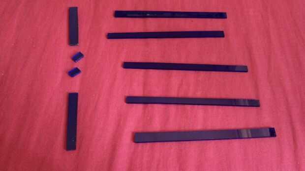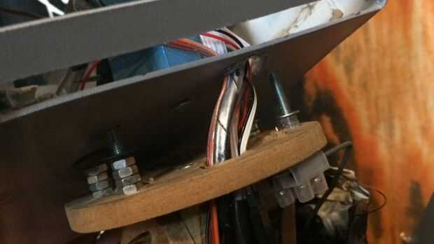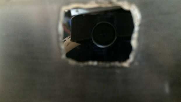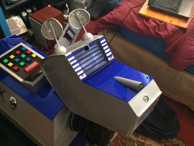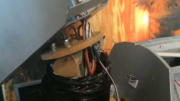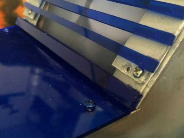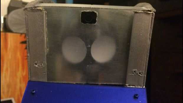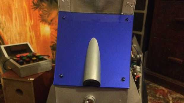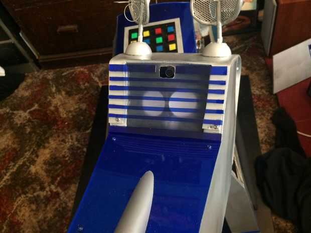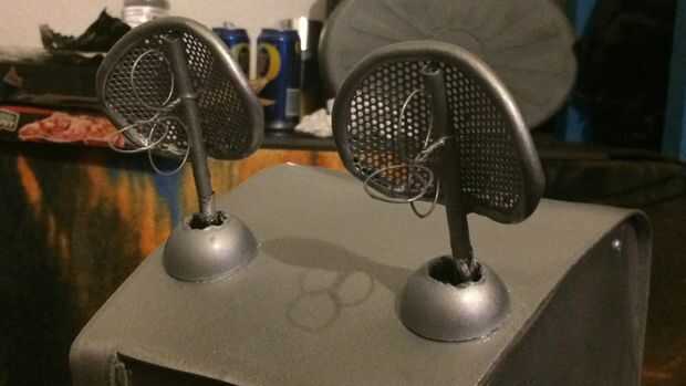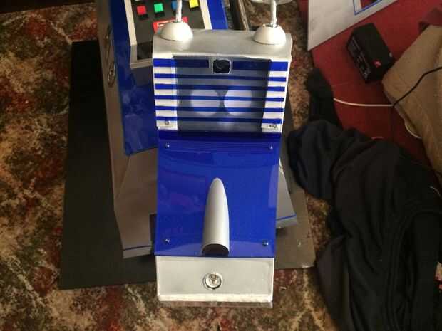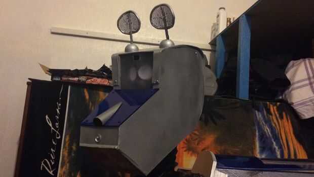 Un agujero fue perforado y los cables fueron alimentados a través de él. El interior de la cabeza fue cubierto y enmascarado, el la cabeza y el panel central superior eran cebados, pintados y lacados. Una vez seco todo fue desenmascarado y montar el panel superior de la cabeza. Una pieza transparente de plexiglás se cortó (con un pequeño orificio para la cámara), ligeramente lija por un lado, luego del panel de ojo. Entonces pequeñas longitudes de acrílico azul fueron cortados y conectados, uniformemente espaciados, el lado externo del ojo.
