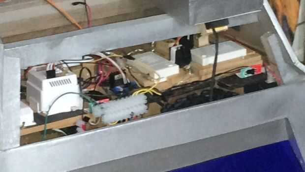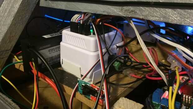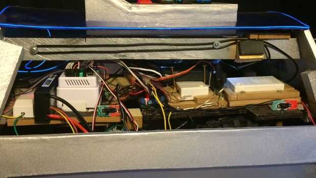 Ahora las cosas se ponen aún más interesantes. Para la casa y asegurar el EZ-B, I cortar cuatro pedazos cortos de "L" en forma de enlace del alambre del PVC, fijados en el interior del cuerpo en la plataforma y sentado el EZ-B. Entonces uno por uno conecté todos los cables de servo, cable de cinta de cámara de 6 pines, el cable de cinta de 4 pin i2c de los cables del sensor humo analógico cámara, cables de puente H y los cables del sensor ultrasónico (esto se instalarán pronto). Los cables del interruptor de relé remoto fue conectado al conector de barril de EZ-B y conectado a la EZ-B. (También he añadido un interruptor de aislamiento de energía entre la batería y los cables de EZ-B y entre la batería y el puente H para el mantenimiento y el sistema total cerrado para salvar vida de batería cuando K-9 no fue utilizado durante largos períodos).