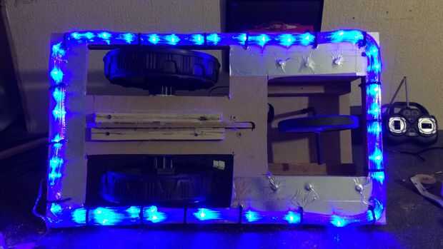 Una manera barata pero muy eficaz de conseguir algunos aspecto brillante y fresco iluminación debajo del chasis era utilizar una cadena de 40 pilas luces LED azul que tiene ocho modos que destellan, una longitud de tubería de claro, algunos lazos zip y algunas cintas de aluminio. Me mide dos longitudes del tubo para que se ajuste alrededor del cada lado del chasis, cortado a la medida y corte a lo largo de ellos con un cuchillo. Alimenta las luces LED a una longitud del tubo y agrupados por los bulbos uniformemente el estaban juntos. Una vez hecho esto dispone la segunda longitud de la tubería sobre el primero para cubrir el cuchillo corte hice. Luego cubrí toda la base del chasis con cinta de aluminio que actúa como un reflector. Luego perforé algunos agujeros uniformemente alrededor del borde de la base del chasis. Finalmente os adjunto el tubo de la iluminación al chasis con abrazaderas de plástico que fueron alimentados a través de los orificios perforados. Compartimiento de la batería el LED se colocaría en el cuerpo más tarde.