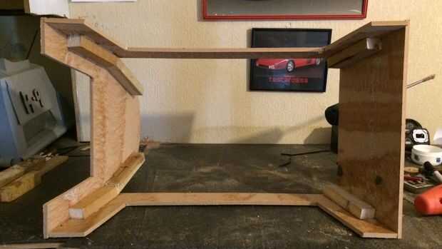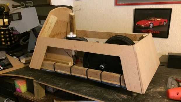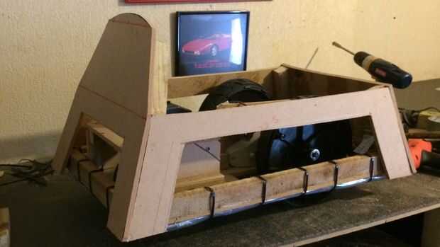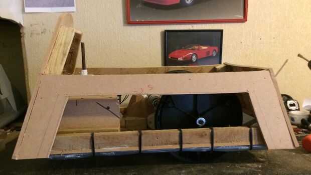 Para empezar el cuerpo primero hice el marco midiendo y cortando algunos bastones de 1 x 1". Luego se atornillan juntos para formar la forma general del cuerpo. Cuatro más, cortos, Porras se cortaron y se fija dentro de las cuatro esquinas así que descansaría en el chasis. El marco entonces fue se basaba en el chasis para asegurar un buen ajuste, sat uniformemente y marcada separación de tierra para los paneles de carrocería más adelante. Se hicieron ajustes en caso necesario.