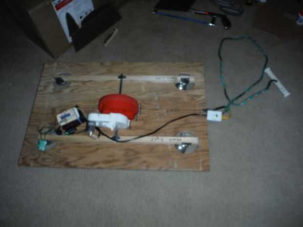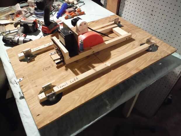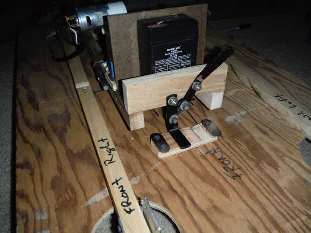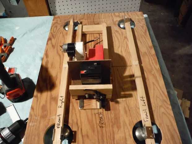 Para mover mi K-9 usé el sistema de transmisión de un paseo de los niños en el tren. El tren es clasificado para hasta 50 libras, así que sabía que le movería. Montara el motor / montaje de la rueda a un marco de sub con bisagras para permitir que la rueda para mover arriba y abajo, un poco. Yo planeaba ponerse las pilas en cajas en el bastidor para que la mayor parte del peso se monta en la rueda para mejor tracción. Os adjunto el montaje de freno de una vieja silla de ruedas al frente de la estructura de sub para levantar la rueda del suelo en el caso de las baterías murieron o algo funcionado incorrectamente. Con la rueda de arrastre del suelo las ruedas rodillo lisas y K-9 se convierte en un juguete gigante pull.