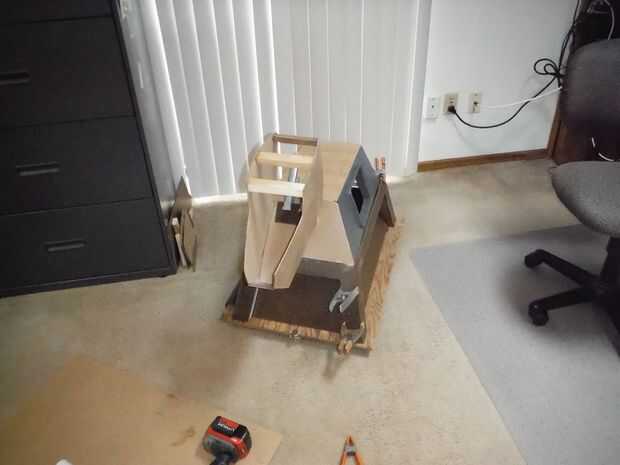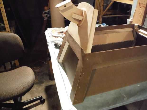 Decidí usar un cuello fijo por ahora. Luego podría probar y hacer su movimiento de cabeza. Hice el círculo inferior con un serrucho grande y algunas chapas de madera de desecho. Tenía que adivinar en el ángulo pero comparando los planes y fotos a lo que yo creo que tenía salieron sobre derecho.