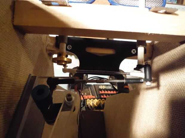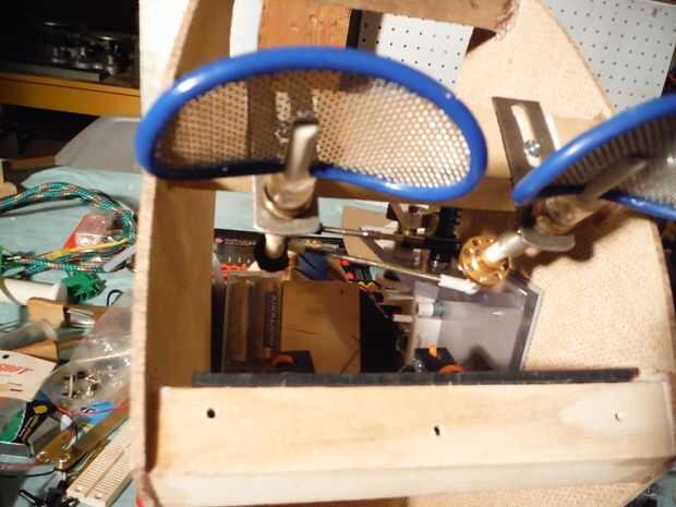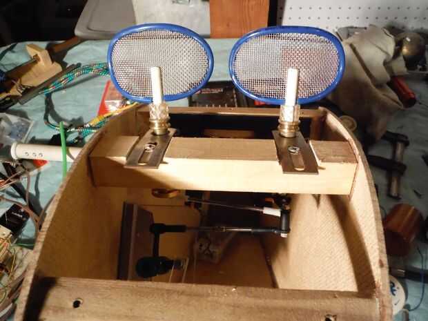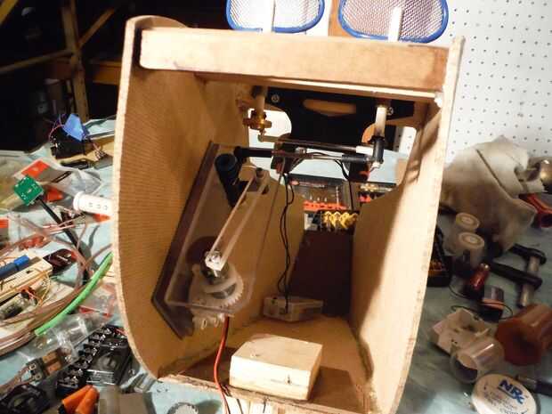 Utilizando algunos lexan 1/4" hice un soporte para el sistema de impulsión de oído. Yo enganché un motorreductor de juguete a una pequeña unidad de biela de un compresor neumático de coche. Un enlace de lexan pequeño conectado a algunos bits del coche viejo y tengo dos ejes que giran en direcciones opuestas. Los oídos se están hechos de pequeños tramos de varilla de fibra de vidrio y acero inoxidable proyección. El azul en el exterior es 1/8" línea aérea en rodajas a lo largo y super pegado. Las orejas ajuste hacia abajo en el eje en una ranura cortada con una sierra joyeros y se llevan a cabo en pequeños tornillos de la parte posterior con conectores RC bola como la pequeña antena direccional de adelante. Los ejes paseo en suma longitudes del tubo de la lámpara y tienen pequeñas longitudes de tubería alrededor del encogimiento actuando como bujes.