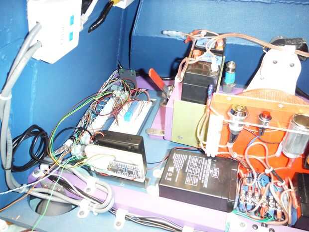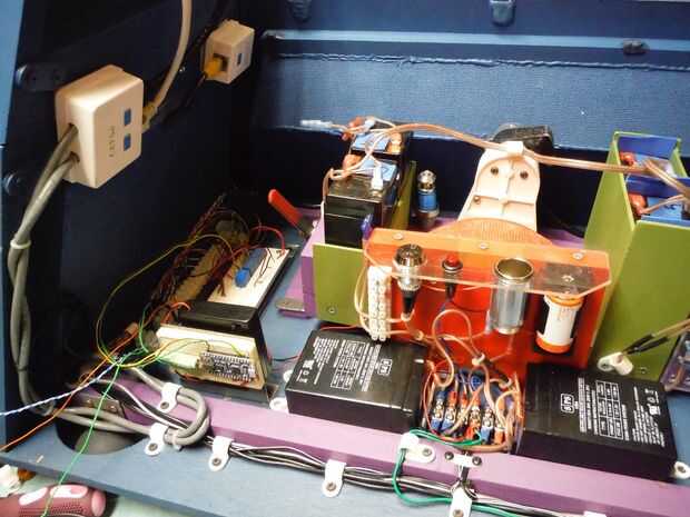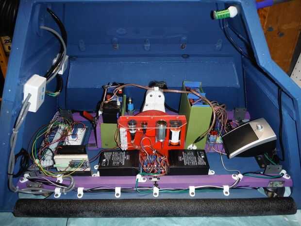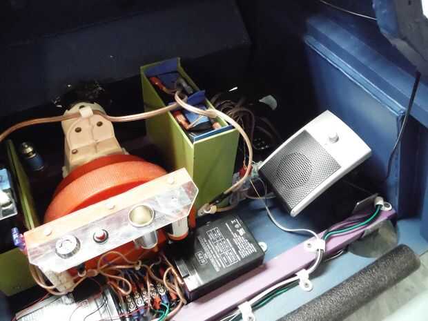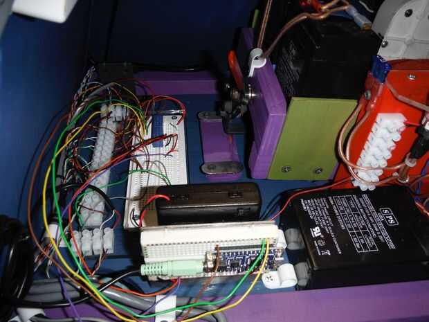 Bien después de los problemas en el Comicon, yo sabía que necesitaba hacer algunos cambios. Para comenzar con reelaboró el tablero de alimentación de 12 voltios para incluir un interruptor de dos posiciones que se utilizará para cambiar la potencia del motor de 6 a 12 voltios. Alambré también un zócalo de coche de 12 voltios a través de un fusible para ejecutar el adaptador para el iPad. El sistema de 12 voltios también alimenta un conjunto de altavoces de ordenador para dar K-9 una voz mucho más fuerte. Un altavoz se monta en la cabeza y el segundo (con el control de volumen) se monta dentro del cuerpo. La Junta Adafruid de FX sonida tiene su propio lugar especial y he modificado un portapilas para darle la tensión más baja que necesita.