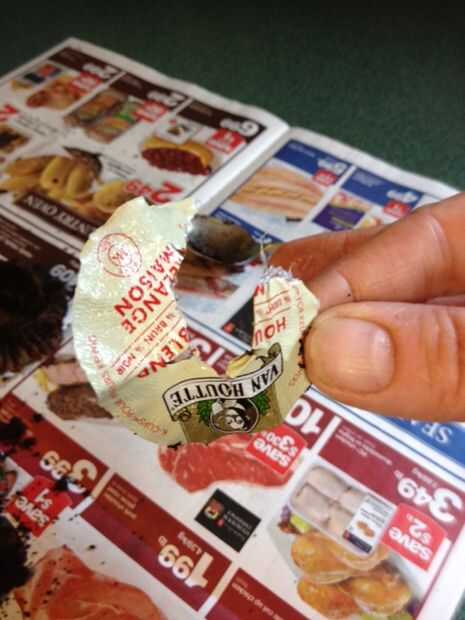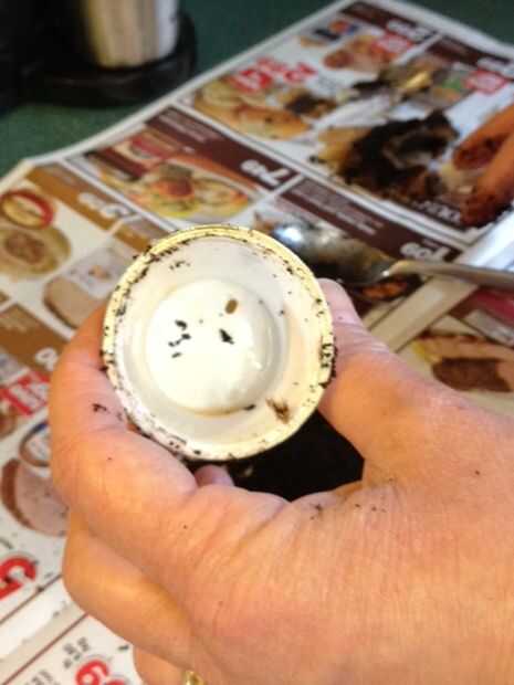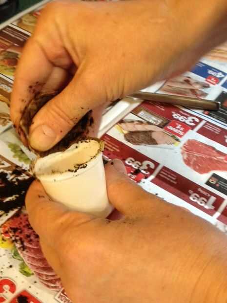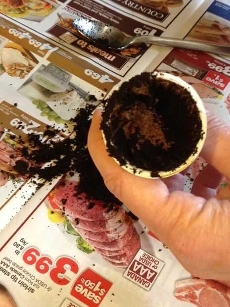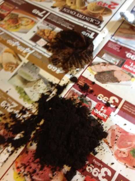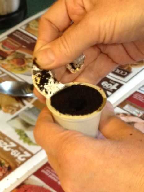 Una vez que la Copa esté fría puede comenzar a tomarlo además. empieza por tomar el papel de la parte superior. Usamos una cuchara para eliminar los motivos y poner la en un pedazo de periódico. Los motivos están fuera, quitar el filtro, y luego enjuague la Copa.