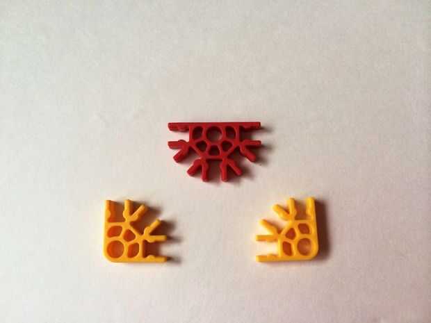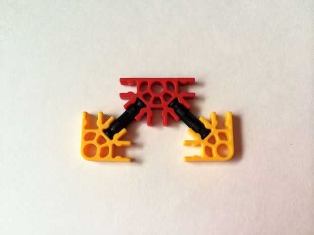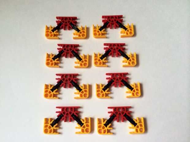 Conectar dos conectores amarillos y un conector rojo con barras negras, como en fotos 1 y 2. Repita el procedimiento para obtener ocho piezas total.