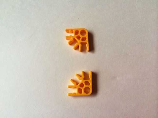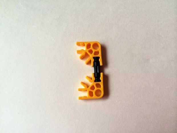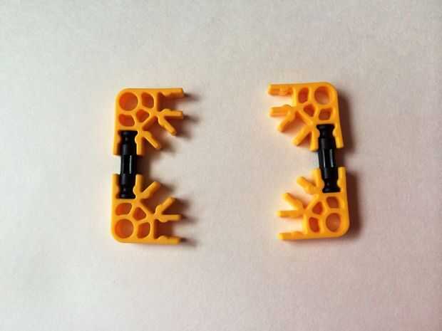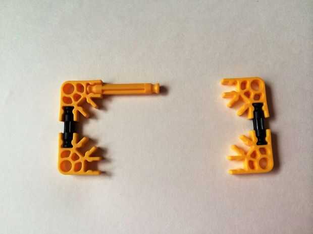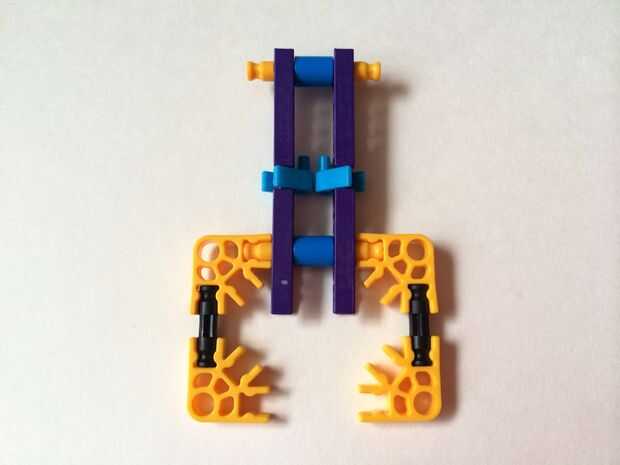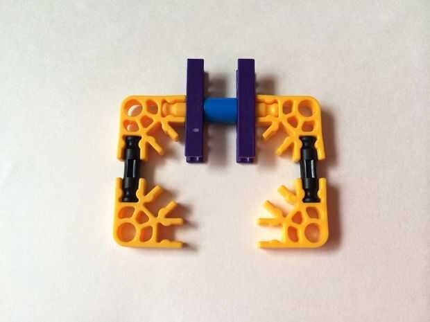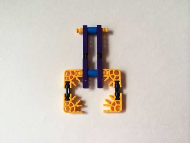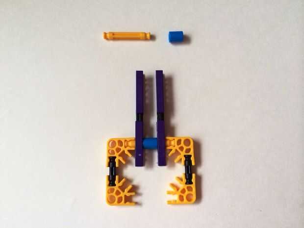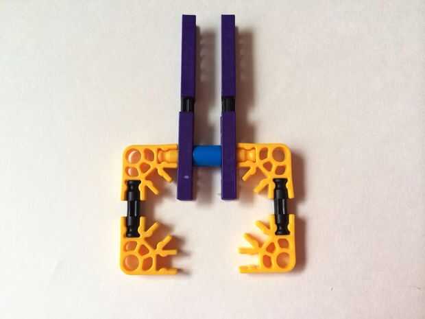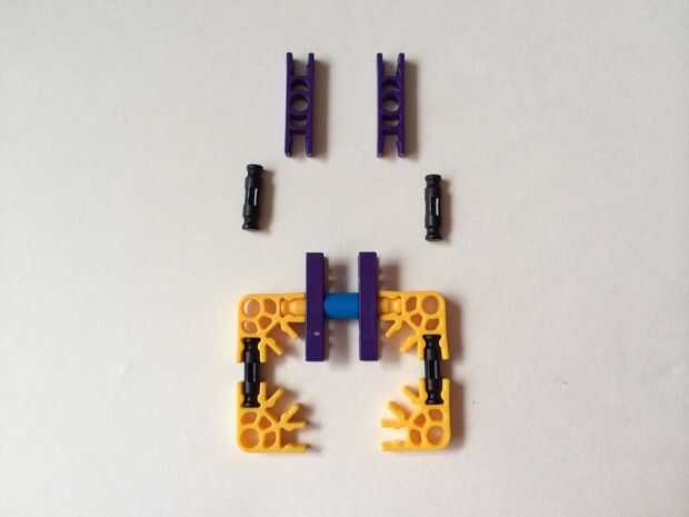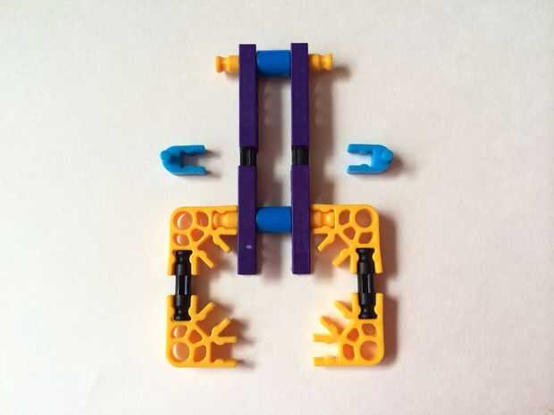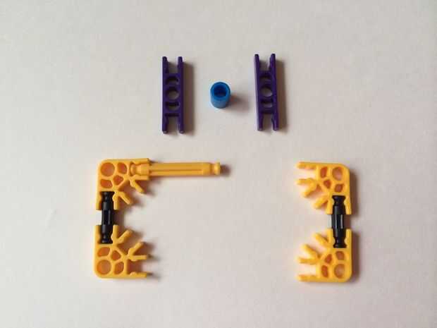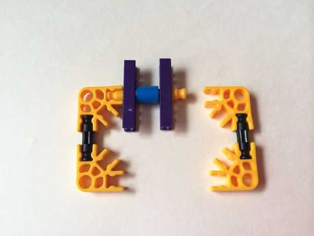 Conectar dos conectores amarillos con una varilla negra como se muestra en fotos 1 y 2. Repita el procedimiento para obtener dos piezas. Añadir una barra amarilla a una pieza, como se muestra en la figura 4 y añadir dos conectores morados con un separador de azul en el medio y luego conecte la varilla amarilla, como en fotos 5, 6 y 7. A continuación, agregue dos conectores púrpura más usando barras de negro como en cuadros 8 y 9. Añadir una barra amarilla con un conector azul entre los conectores púrpura como en fotos 10 y 11. Por último, añadir dos cerraduras de rotación azul a las barras negro conecta los conectores púrpura como en fotos 12 y 13.