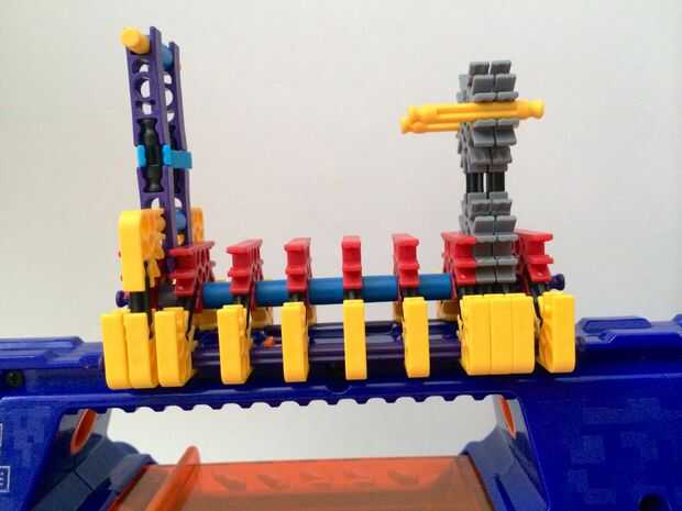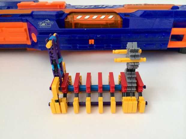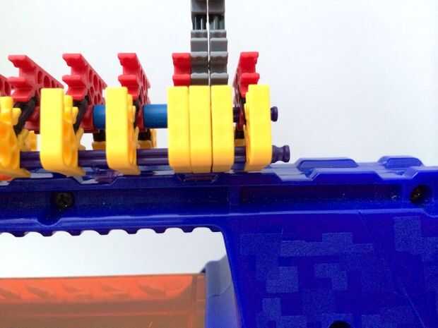 Para fijar la vista alineada de K'nex a un Nerf Blaster, enganchar las piezas de reversa tac-carril todo del rail táctico de la pistola Nerf, como en cuadro 2. Alinear el espacio de 1,5 milímetros con el quid de metal pequeña debajo del carril táctico como en la foto 3, luego coloque la vista en el blaster. El quid mantendrá a la vista de resbalar o caerse.
