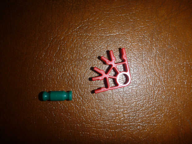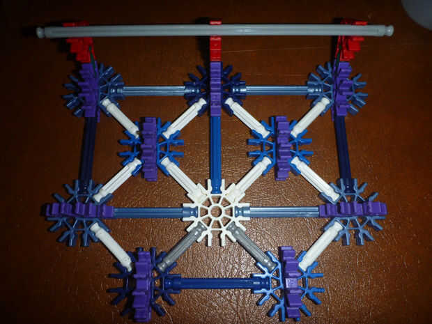 C. Conecte la barra verde al conector rojo formando tres 3 piezas en todos (cuadro 7) y coloque en la ranura de 45 grados del conector morado frente (cuadro 8). Coloque una barra gris en ranuras superiores de los tres conectores rojo (cuadro 9).