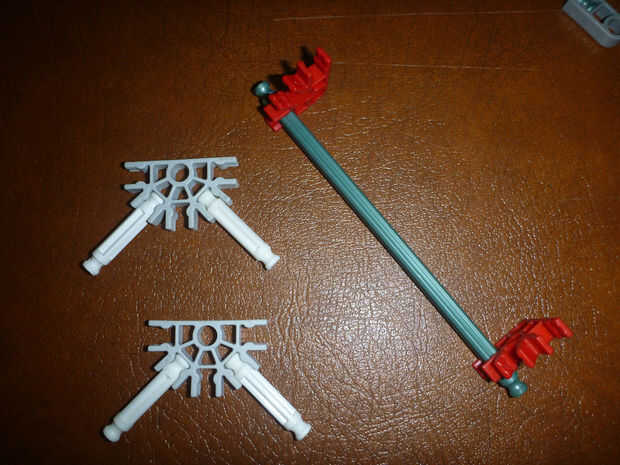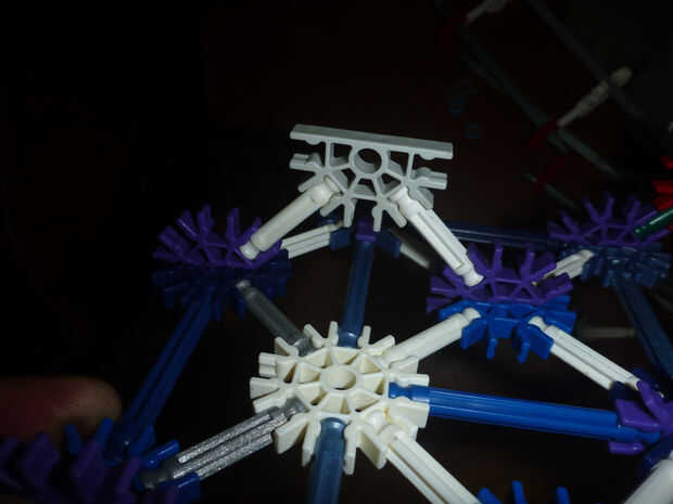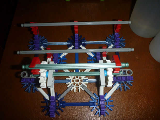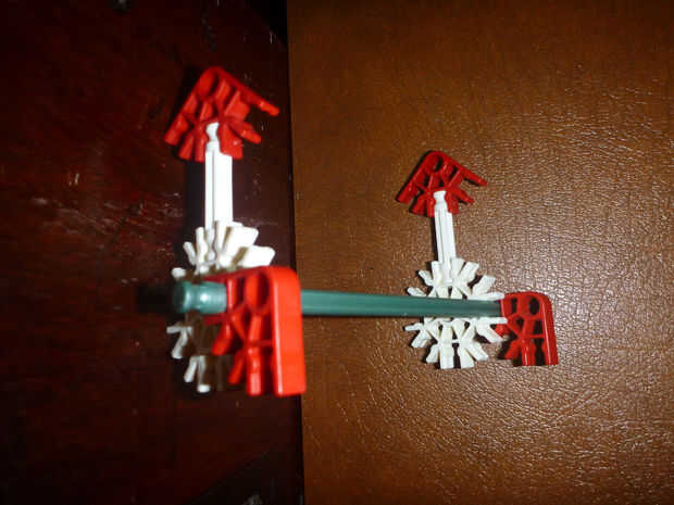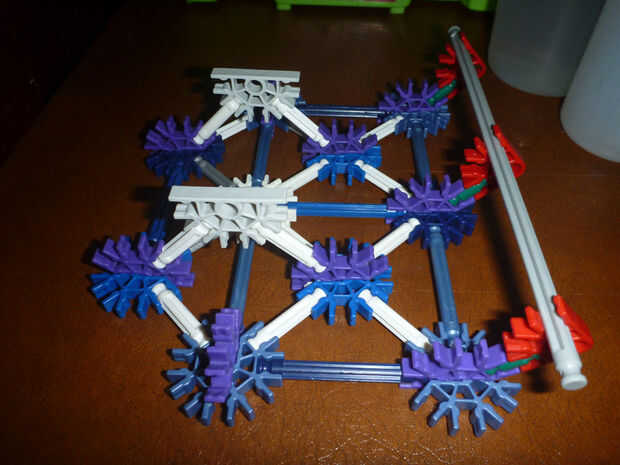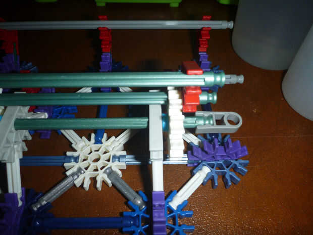 D. con la pieza formada en cuadro 5 B, inserte la varilla roja (metálico verde en la figura 6-B) en el agujero del centro del conector con los conectores rojos frente a frente; colocar un relleno azul entre el blanco y centro el agujero del conector amarillo (gris claro en la figura 6-B), haciendo esto en ambos lados. Acople el conectador gris en los extremos de la barra del rojo (verde metálico).