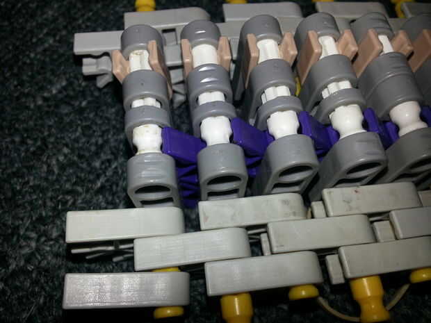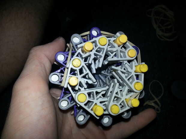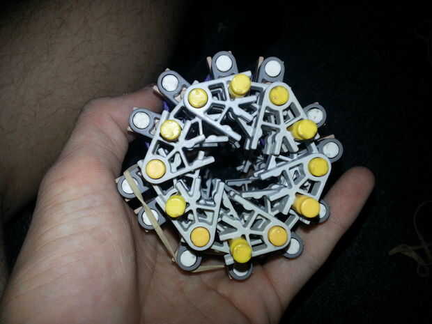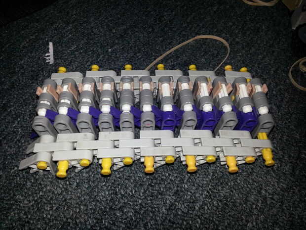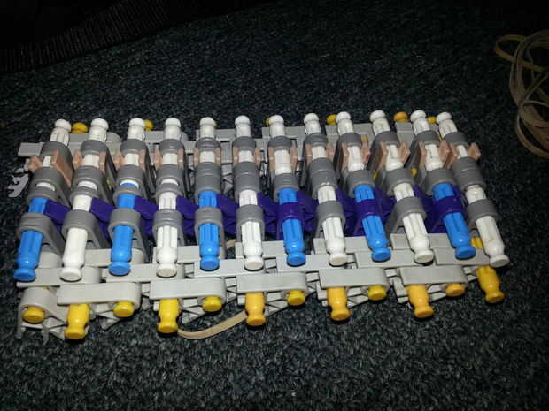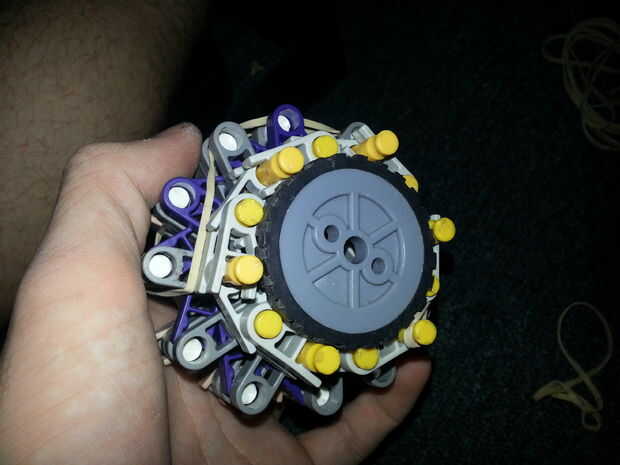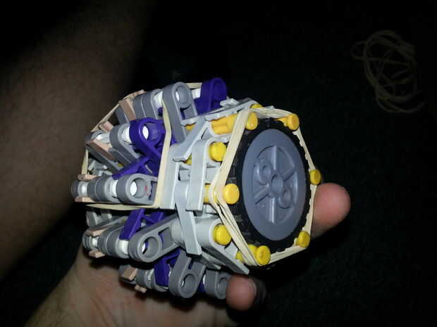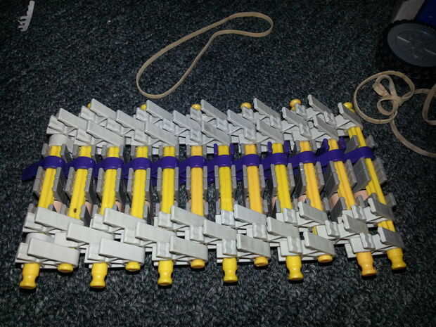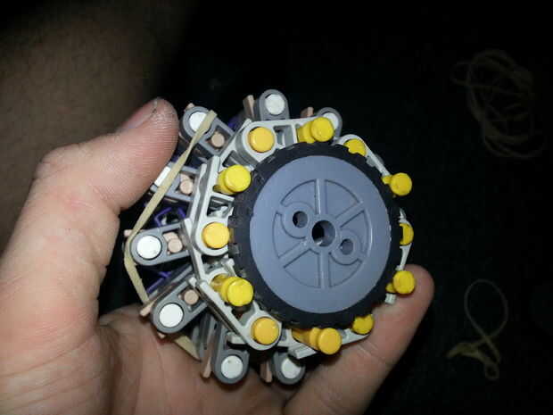 7) envuelve una banda elástica alrededor de la clavija amarilla, ahora recuerdo a mantener las barras del amarillo en su punto más lejano! Sólo 6 extremos deben salir tan gruesa como el neumático es!