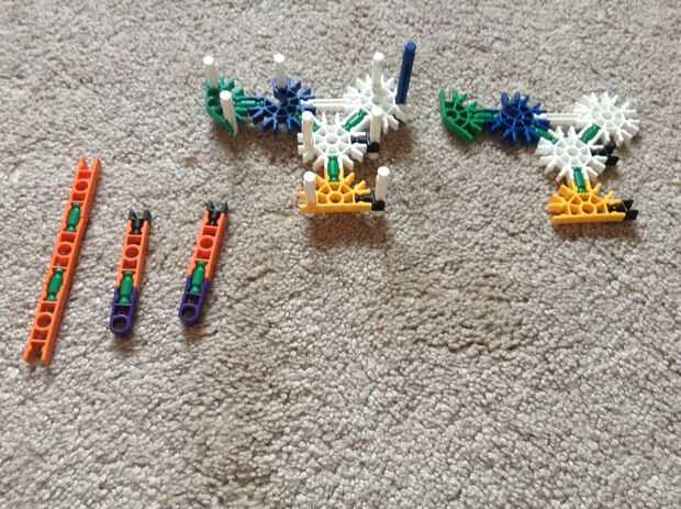 esta pequeña pistola K'nex es muy simple y utiliza solo 12 piezas (no incluye munición o una vista). No utiliza una banda elástica o bien.Paso 1: partes Arma:4 barras azul2 barras amarillas1 barra blanco2 conectores verdes1 conector amarillo3 conecto