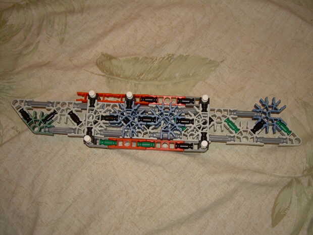 Atar los elásticos juntos. Dentro del bucle del elástico debe ser el primer plano 2 clavijas blancas a cada lado. El nudo, si atado en el centro de los 2 elásticos, debe ir directamente en la abertura del conector azul en la hoja.