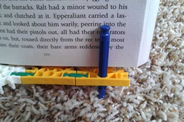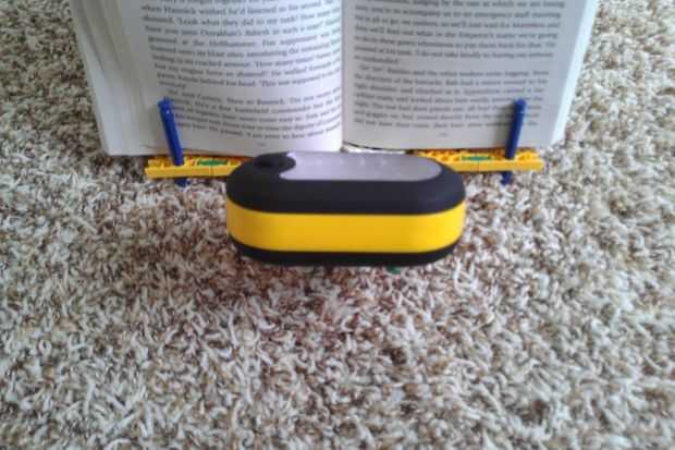 Para insertar el libro, Deslice dos barras azules en el soporte de libro para guardar el libro en su lugar. Coloque la luz en el titular de la luz como se muestra.