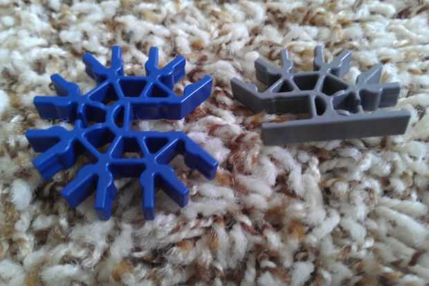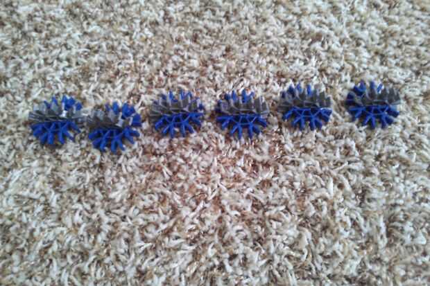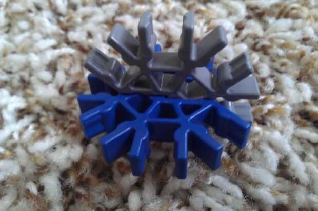 Un conector azul y un conector gris y deslícelos juntos. Repita el procedimiento para obtener seis piezas y conectarlos con barras verdes.