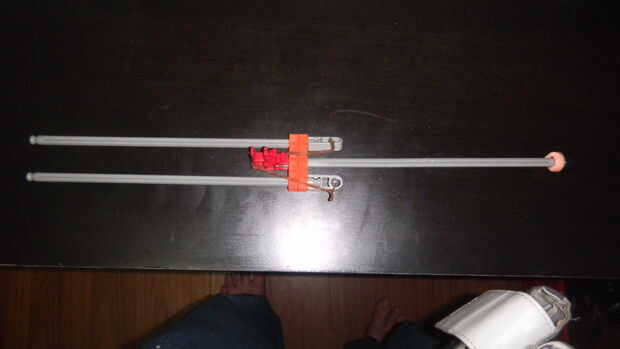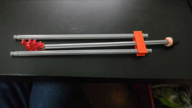 poner en la barra de otra a través de las piezas naranja y asegúrelo con el fin de una nerf dart y una pieza de 3 rincón rojo