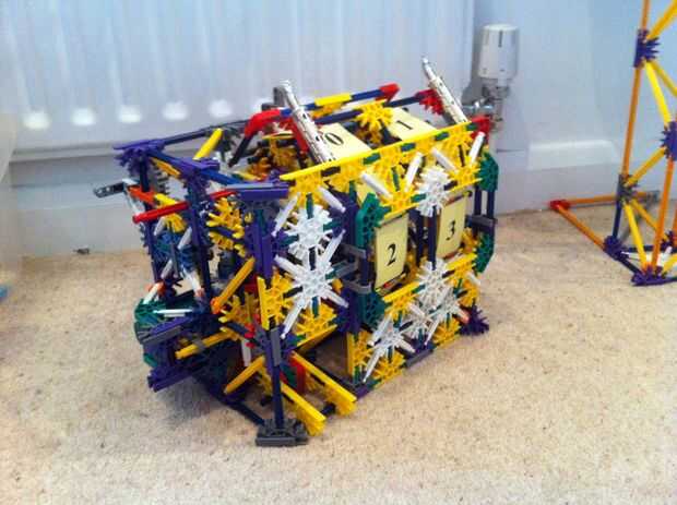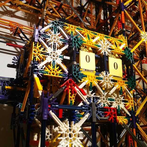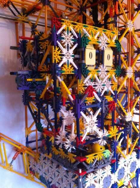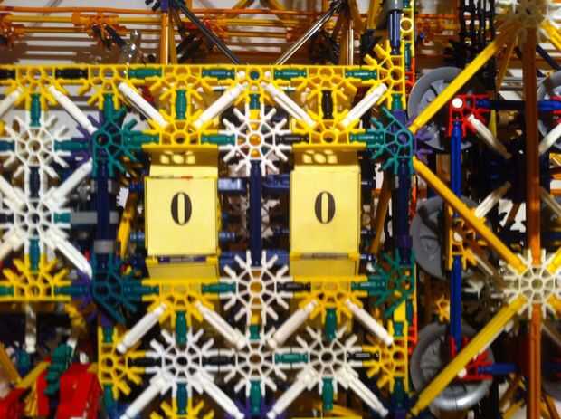 Tiene 1 motor K'nex verde regular que alimenta 2 diales de conteo. Se enciende cuando la bola cae en una tolva y aterriza en un interruptor de puesta en marcha el motor. El motor gira una serie de engranajes que convierte un pequeño brazo girando las unidades Marque el 1/10 de la forma redonda. Hay un clip azul en un lado de la esfera para que cada vez que el disco pasa de 9 a 0 levanta otro brazo que se une a un engranaje. Este arte de pesca mallas con un engranaje dado vuelto por el motor y entonces usando la potencia de los motores da otro pequeño brazo que convierte las decenas columna. Este engranaje entonces se restablece hasta que se gire otra vez para malla. La máquina entonces también se apaga después de un completo circuito con un diseño creado por shadowman39 que he modificado así que créditos a él.