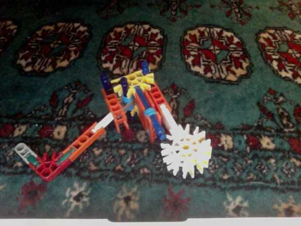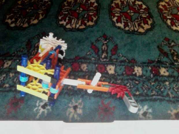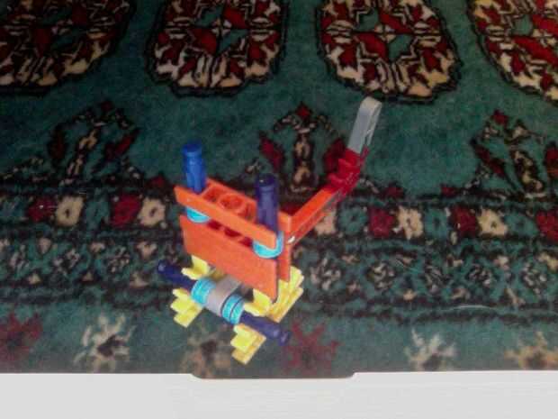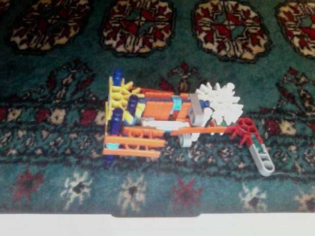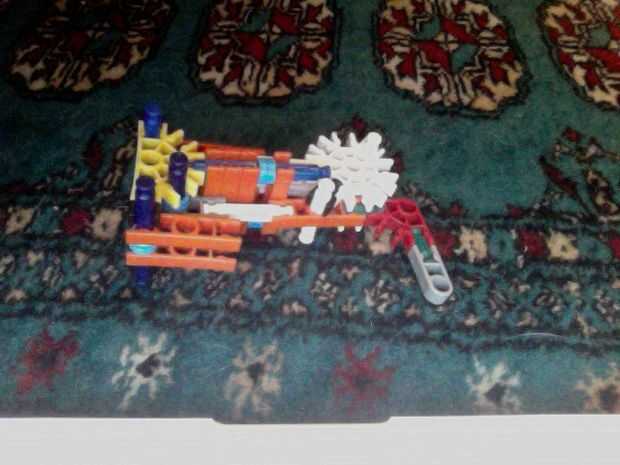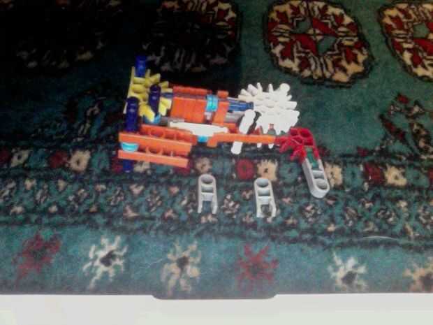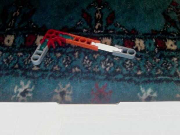 Hola, este es mi K'nex pistola, dispara balas de por lo menos 2 al mismo tiempo y tiene mucho poder. He intentado hacer la pistola más sólido de su forma original mediante el refuerzo de las piezas alrededor del gatillo con conectores escalera naranj