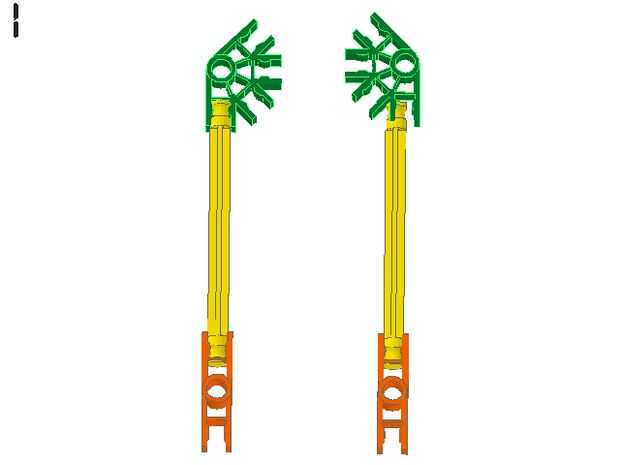 muy sencillo y original diseño. No use demasiadas piezas.Barras:Verde 395 gris2 azulConectores:2 amarillo23 naranjaVerde 154 rojoGris oscuro 15Otros:4 separadores azul6 espaciadores gris2 conectores 'Y'Paso 1: piernas Conectores naranja 64 conectores