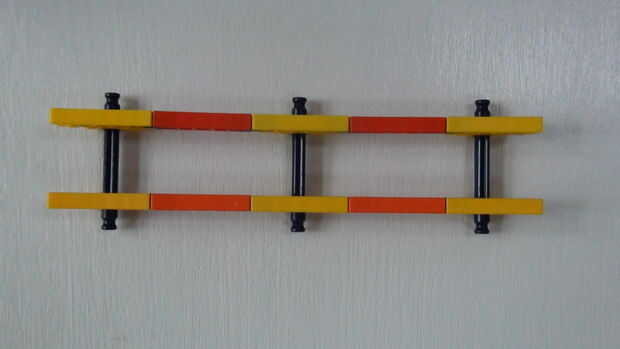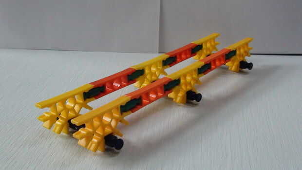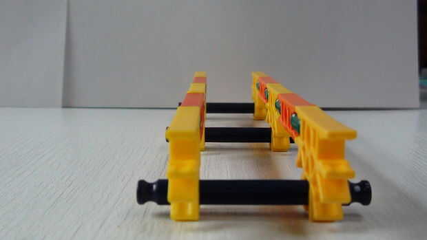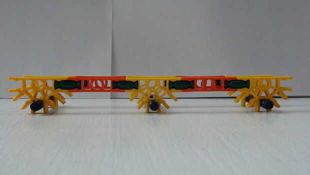 Casi lo mismo como paso 2, pero cada conector es naranja, en lugar de amarillo. Bastante robusto para distancias cortas. La bola no tiene que tener cualquier impulso en este camino (mientras está en una inclinación), ya que es perfectamente lisa.