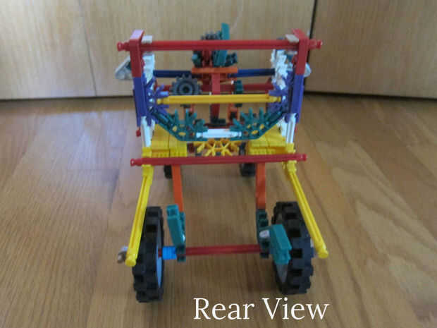 Hi i made this k'nex bulldozer , which has steering and a digging scoop. También tiene unas escaleras ubicadas en la parte trasera del vehículo. El manejo posterior es una gran idea porque ayuda a la topadora manejar mejor que un coche alrededor de l