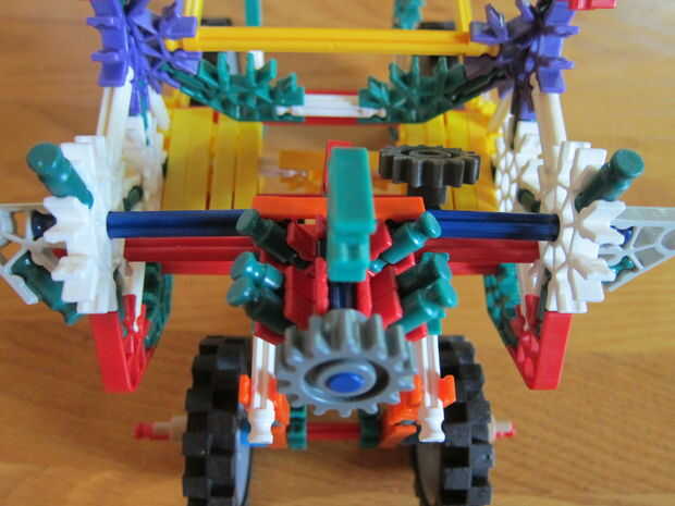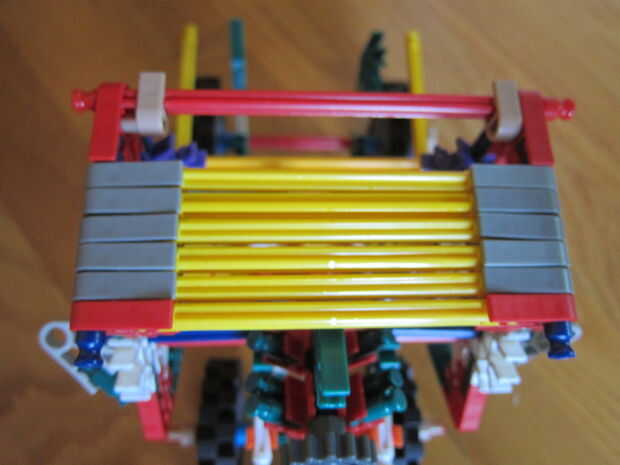 Hi i made this k'nex bulldozer , which has steering and a digging scoop. También tiene unas escaleras ubicadas en la parte trasera del vehículo. El manejo posterior es una gran idea porque ayuda a la topadora manejar mejor que un coche alrededor de l