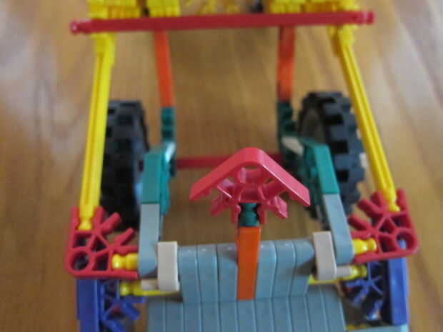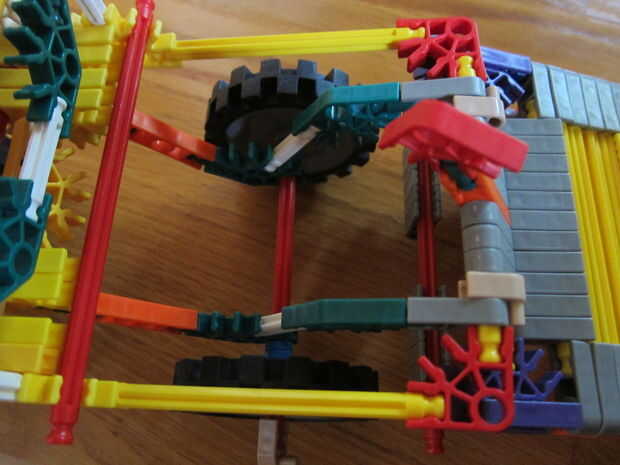 Hi i made this k'nex bulldozer , which has steering and a digging scoop. También tiene unas escaleras ubicadas en la parte trasera del vehículo. El manejo posterior es una gran idea porque ayuda a la topadora manejar mejor que un coche alrededor de l