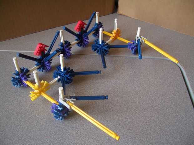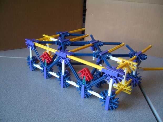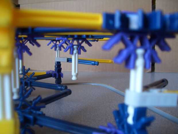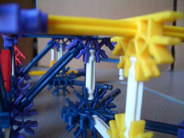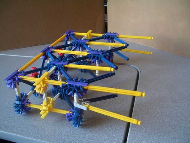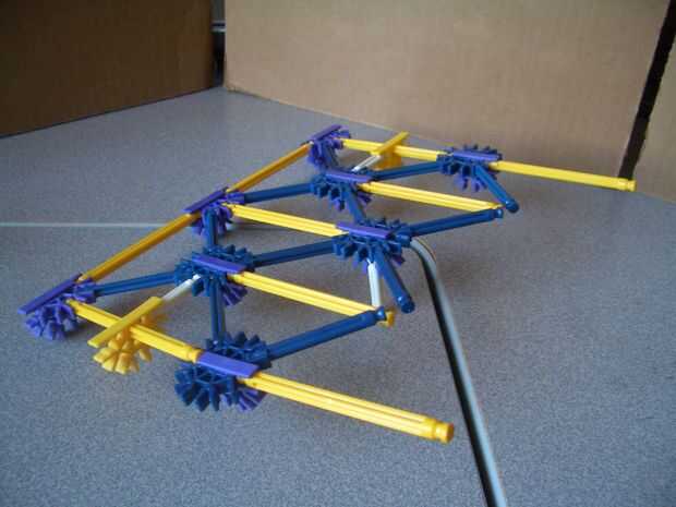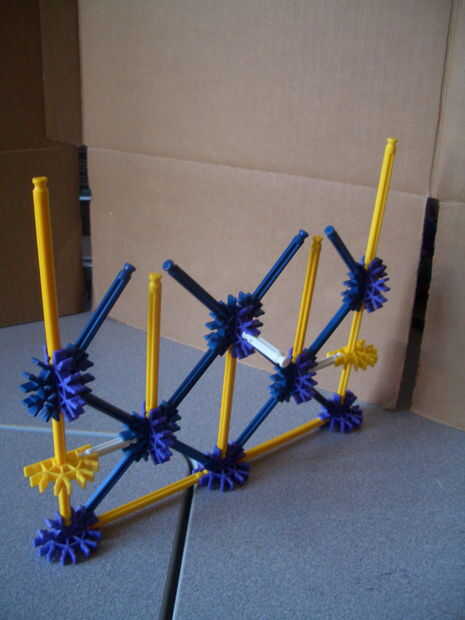 (b) la parte superior de la parte posterior. Tenga en cuenta los dos crossrods blanco conexión a los conectores amarillo, junto con la barra blanca apuntando hacia abajo. Distinto, un enrejado de simple barra azul y amarillo.