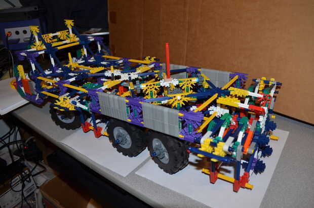 esto es una 4wd K'nex carro con puertas funcionales, un portón, acceso de baterías bajo el capó motor, un volante (dummy), cambio de marchas (dummy), asientos, llanta de repuesto y una cama. El sistema 4wd es rápidamente configurable para la impulsió