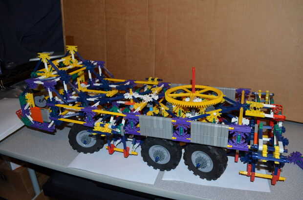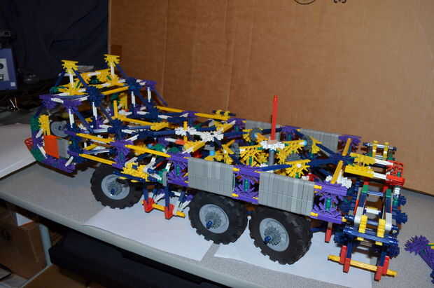 esto es una 4wd K'nex carro con puertas funcionales, un portón, acceso de baterías bajo el capó motor, un volante (dummy), cambio de marchas (dummy), asientos, llanta de repuesto y una cama. El sistema 4wd es rápidamente configurable para la impulsió